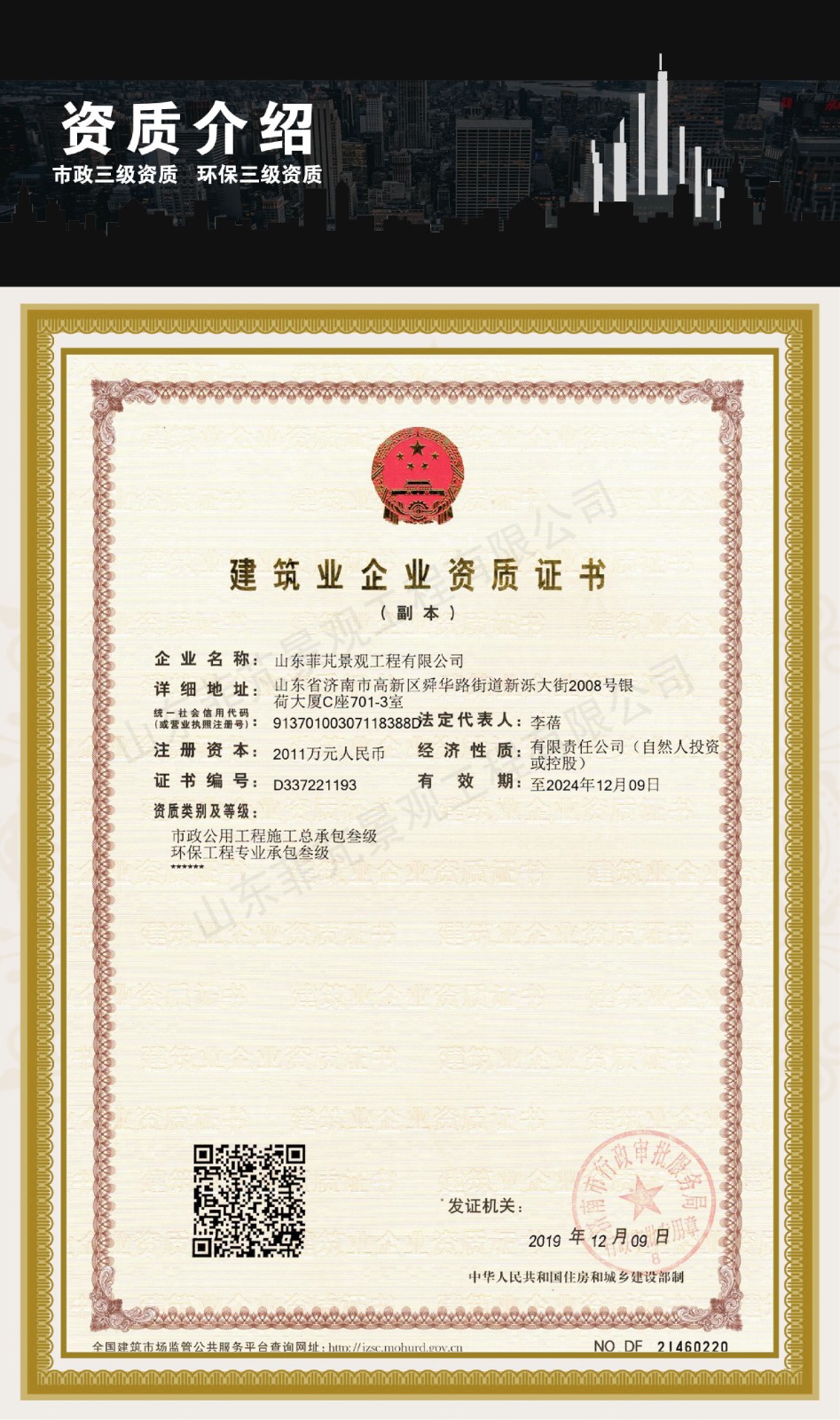 2019年12月9日,我公司正式獲得市政公用工程施工總承包三級(jí)資質(zhì)和環(huán)保工程專業(yè)承包三級(jí)資質(zhì)。這是我公司堅(jiān)持以誠信為先導(dǎo),以創(chuàng)新為動(dòng)力,以服務(wù)為理念所取得的一項(xiàng)重大發(fā)展成果。該項(xiàng)成果的取得,不僅是我公司長期堅(jiān)持創(chuàng)新服務(wù)理念的有力詮釋,同時(shí)也為我公司未來的發(fā)展奠定了基礎(chǔ)。
