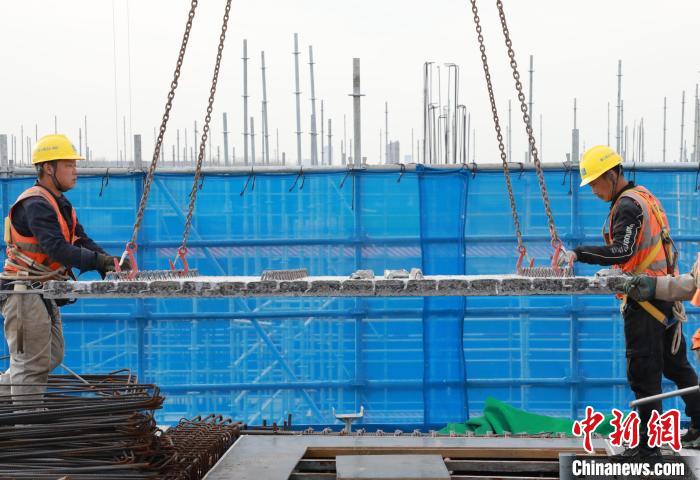 建筑工人在鵲華中和苑建設(shè)現(xiàn)場(chǎng)吊裝疊合板。祁建月 攝
